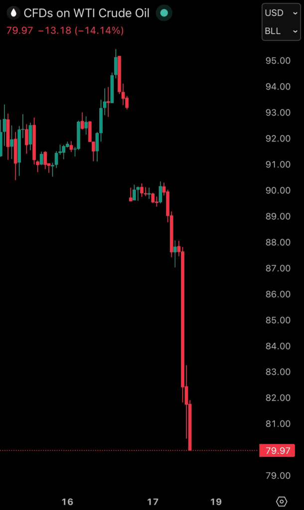 Even with all the tension around Hormuz, US oil prices fell below $80 per barrel. They were down 32% in 9 trading days, and by late week oil had dropped to a five-week low.