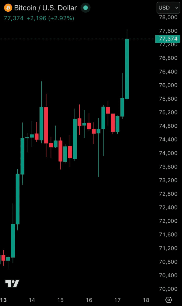 Bitcoin surged above $77,000 for the first time since February 3. That move fit the broader pattern of the week, with risk assets rising as oil fell and equities pushed to new highs.