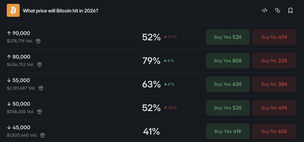 Prediction markets also turned more optimistic. Polymarket traders raised the probability of Bitcoin reaching $90,000 in 2026 to 52%, up from less than 40% a week earlier. At the same time, 79% expected Bitcoin to reach $80,000 this year.