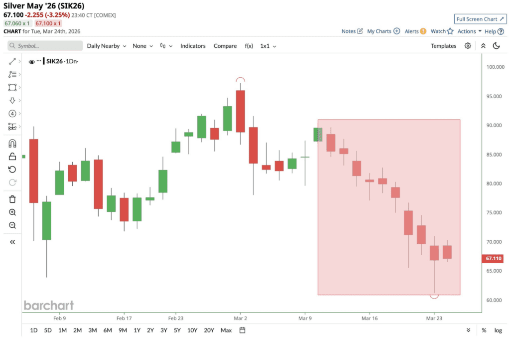 Other market signals pointed to stress too. Silver headed for a tenth straight red close, its longest losing streak since April-May 2022.