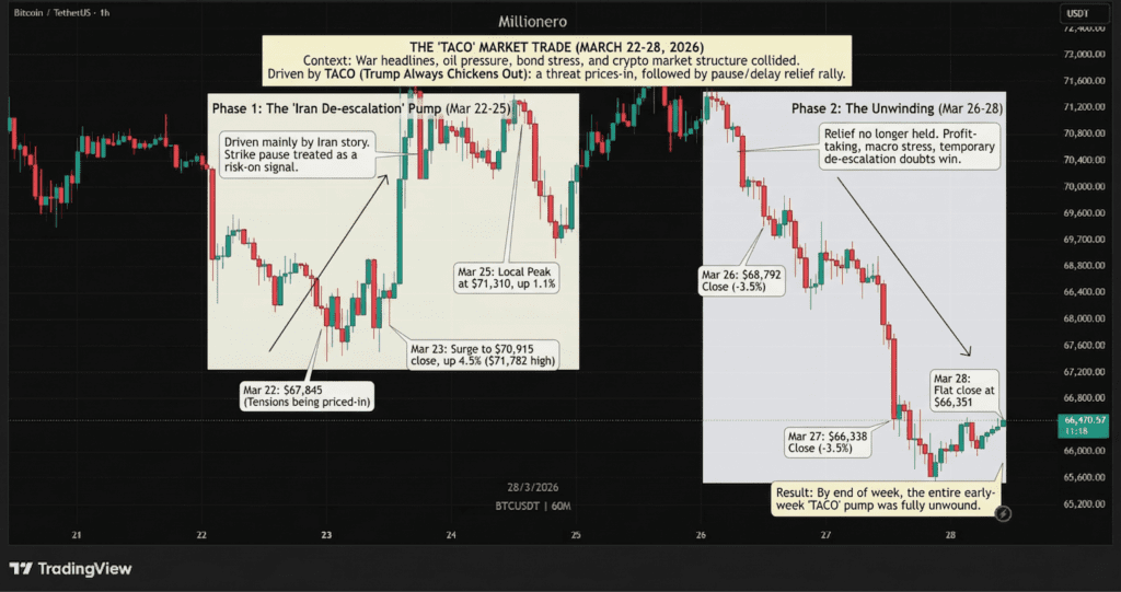 Then the move broke. Thursday, March 26, Bitcoin closed at $68,792, down 3.5%. Friday, March 27, it fell again to $66,338, another 3.5% drop. By Saturday, March 28, it was almost flat at $66,351, but the message was clear: the entire early-week TACO pump had been unwound.