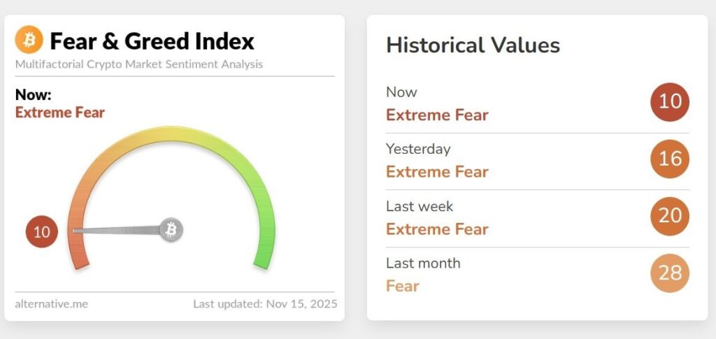 The Crypto Fear & Greed Index fell to 10, which is Extreme Fear. We have not seen this level since February, and back then the market bottomed shortly afterward. This does not mean a bottom is guaranteed, but it shows how heavy the pressure has become.