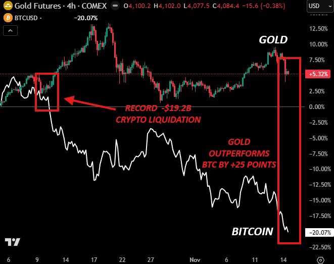 Gold has outperformed Bitcoin by +25 percentage points in one month. Gold continues to rise, while Bitcoin continues to fall. This break suggests that crypto’s decline is not coming from macro weakness, but from internal leverage issues.