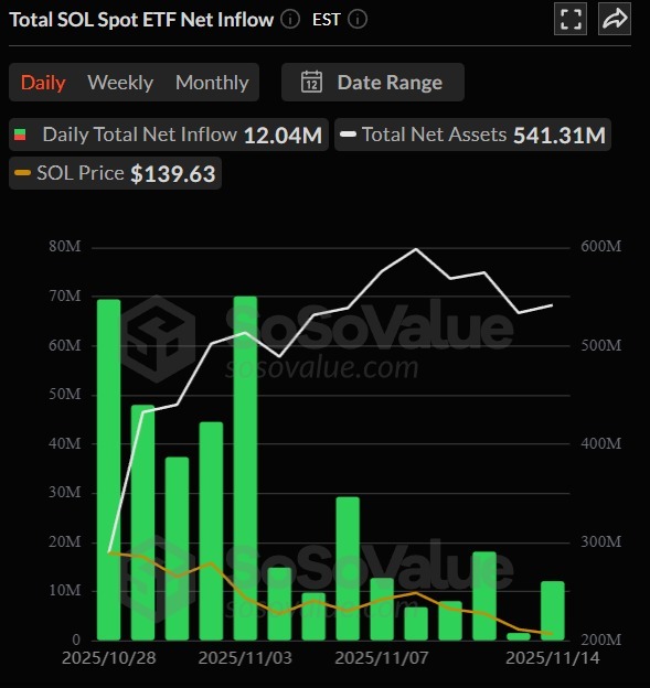 Solana spot ETFs recorded 14 straight days of inflows, totaling $541 million, even while price action remains slow.