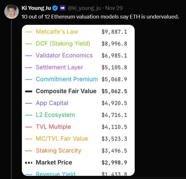On the valuation side, Ki Young Ju pointed to ETHval, a platform by Hashed CEO Simon Kim that aggregates 12 different Ethereum valuation models. According to the data he shared: