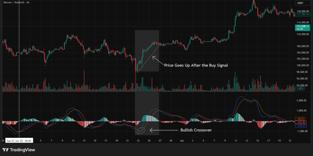 - When the MACD Line crosses above the Signal Line, it’s called a bullish crossover, a potential buy signal.