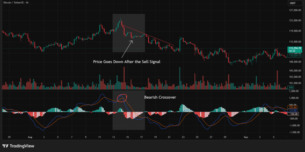 - When the MACD Line crosses below the Signal Line, it’s a bearish crossover, a possible sell signal.