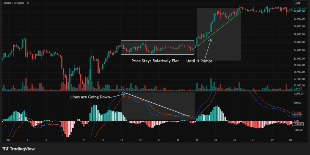 When the lines move close together, momentum is slowing. When they spread apart, the market is heating up.