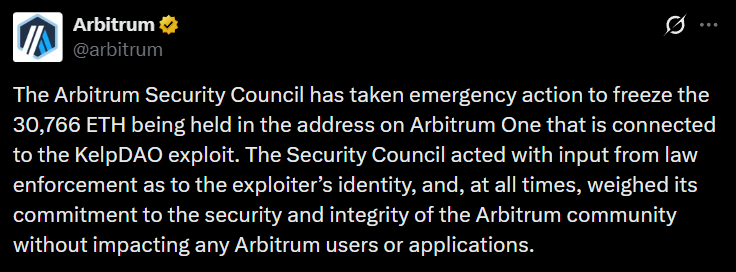 Arbitrum’s Security Council moved fast this week, freezing 30,766 ETH, roughly $71 million, tied to the KelpDAO exploit. The funds were pushed into an intermediary wallet that can only be touched through further governance action, effectively pulling them out of the attacker’s reach.