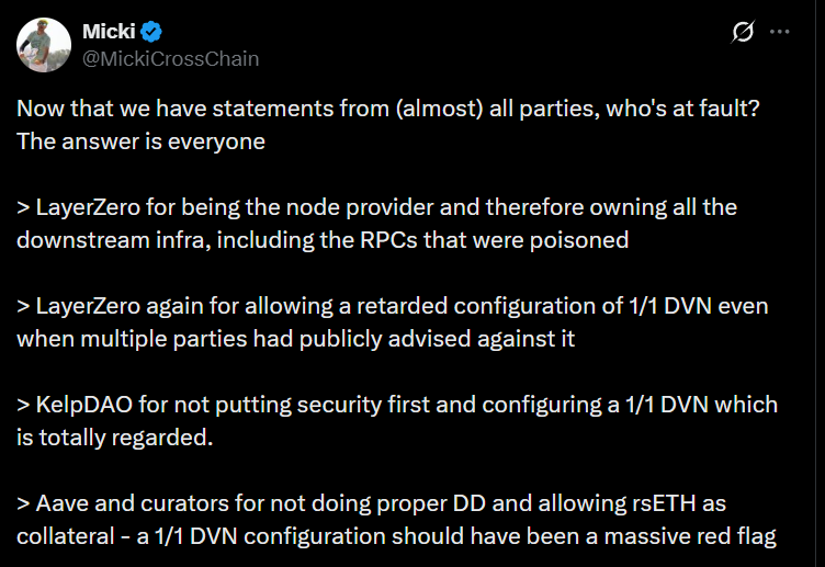 LayerZero pointed at Kelp’s 1-of-1 verifier configuration, one checker, no second safety layer, and argued a stronger multi-verifier setup would have caught the forged message. Kelp pushed back, saying the configuration at the heart of the exploit reflected LayerZero’s own default and the guidance Kelp received during integration.