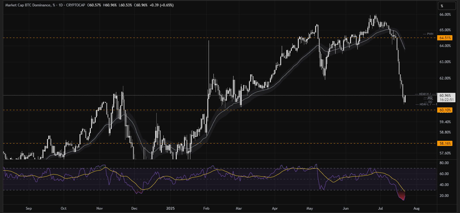 - BTC Dominance: Watch for a confirmed break below 60%.