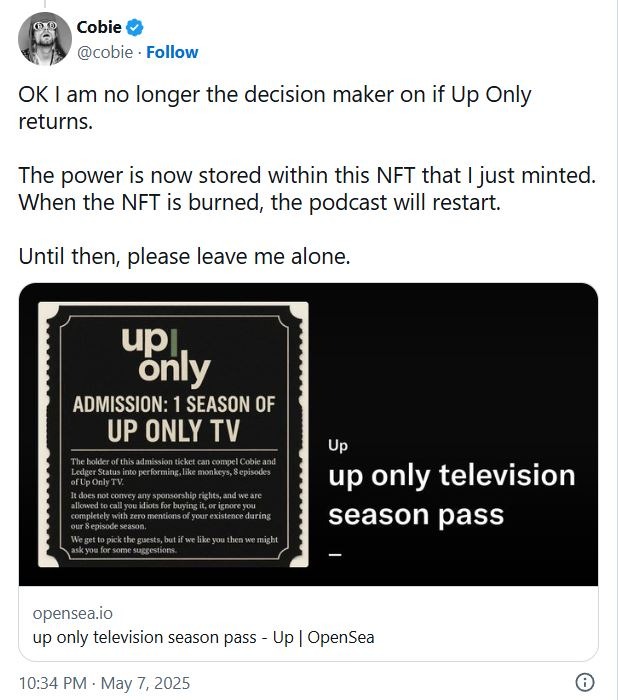 Fast-forward to 2025, and Cobie, ever the mad genius, minted a one-of-a-kind UpOnly NFT. This isn’t your average Bored Ape. The prize? The buyer gets to force Cobie and Ledger to produce an 8-episode season of UpOnlyTV. But here’s the kicker, straight from the NFT’s on-chain fine print:
