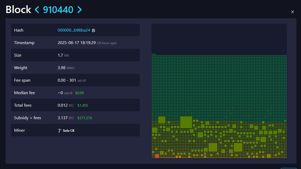 A Solo Miner Found Bitcoin Block 910,440 – Hits $371,000 Block Reward